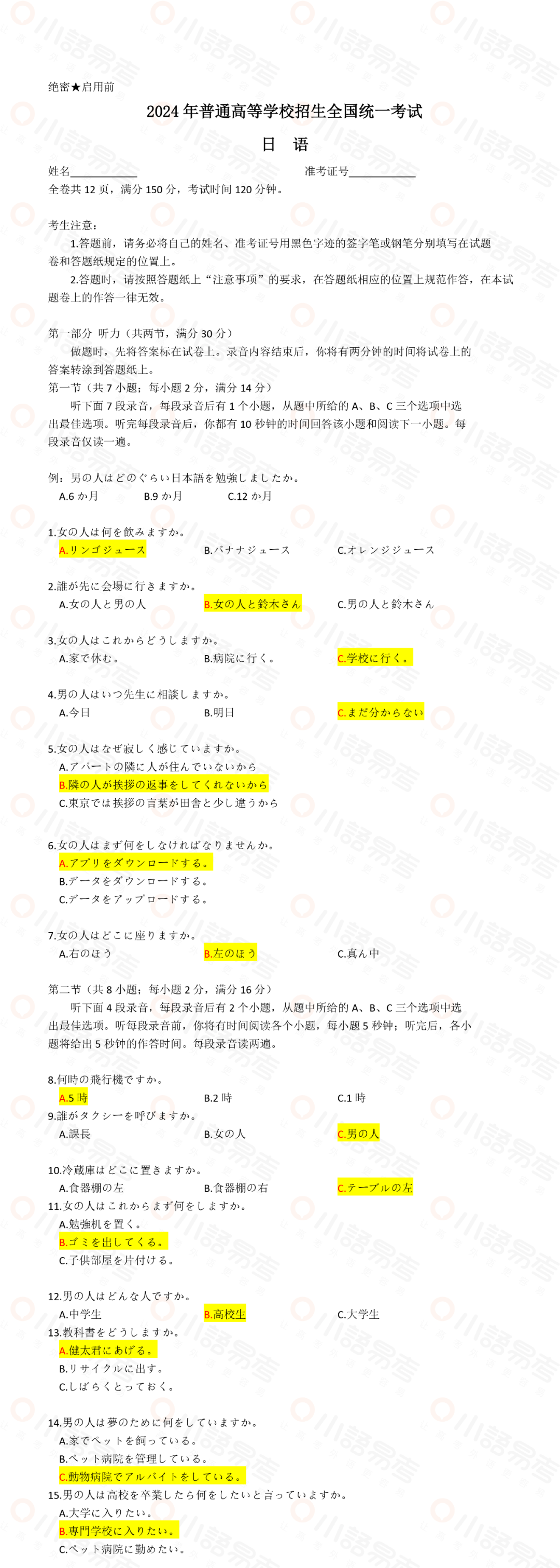 2024年高考日语旧题型完整版真题试卷已更新,小语易考教研部进行了深度解析和整编,供同学们参考学习!