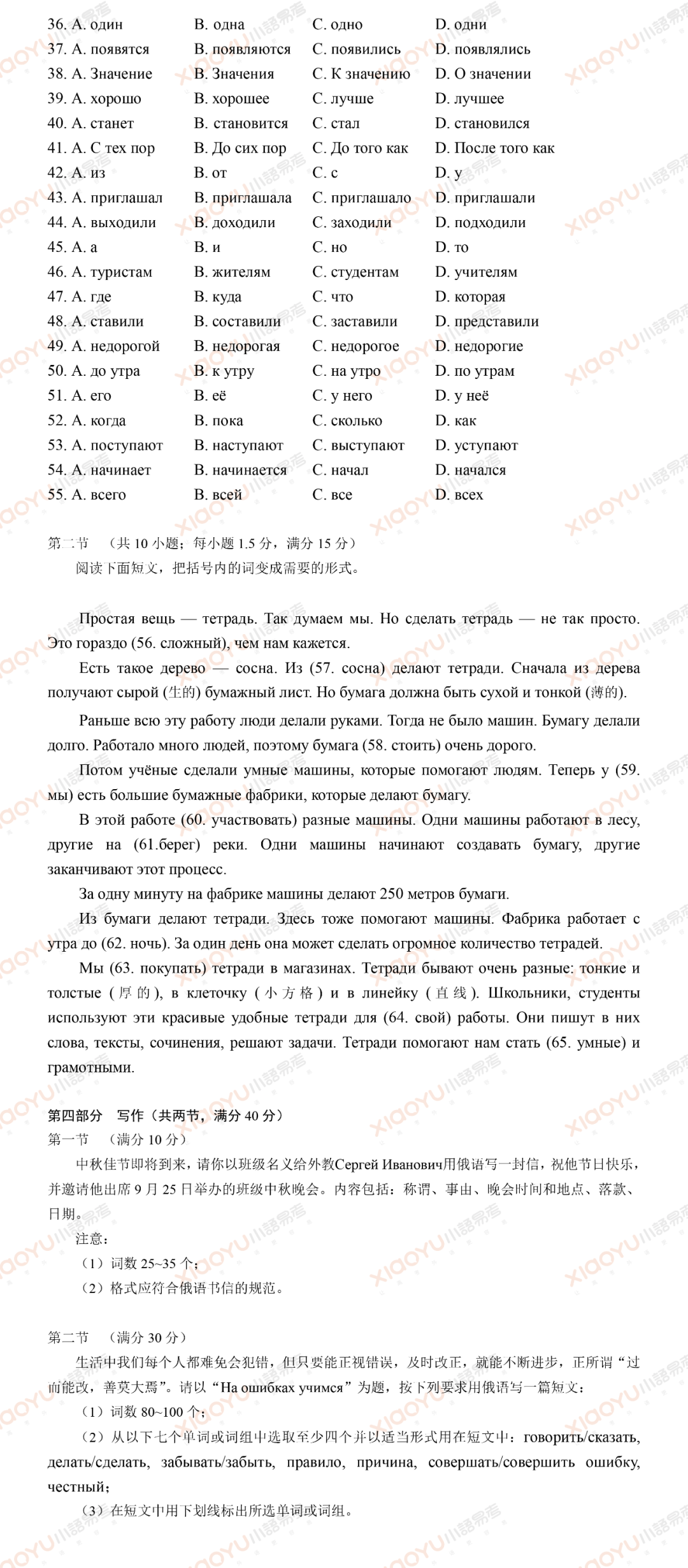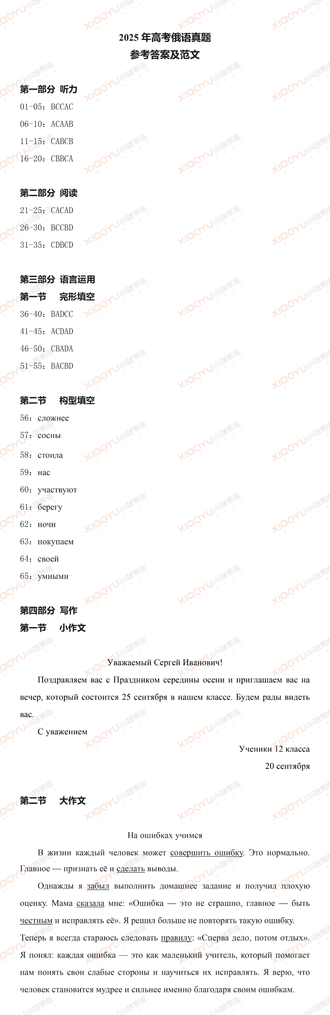 命题作文主题为《На ошибках учимся》(从错误中学习),要求考生使用4个以上指定词汇,突出“反思”与“成长”主题,鼓励学生结合生活经历,展现思辨能力与逻辑表达能力。
