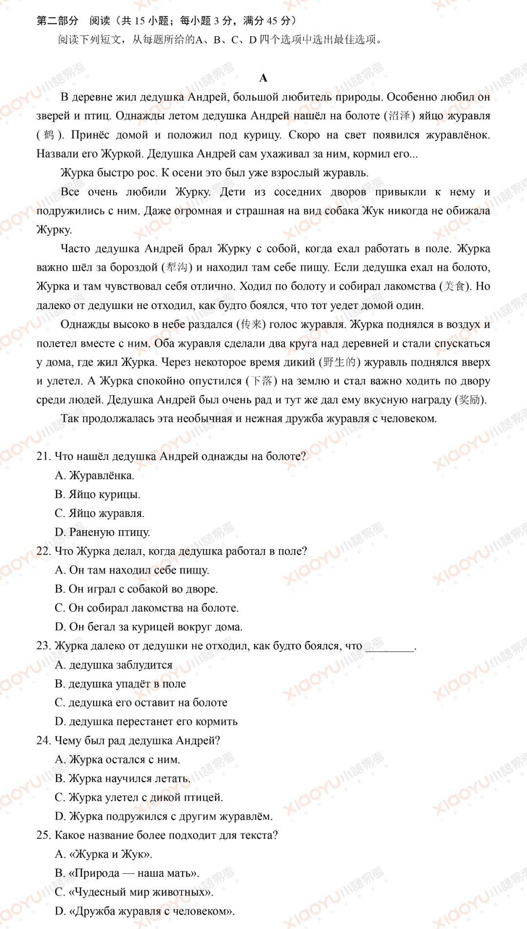在村子里住着安德烈爷爷,他是个非常热爱大自然的人。他尤其喜爱野兽和鸟类。有一年夏天,安德烈爷爷在沼泽上发现了一枚鹤蛋。他把蛋带回家,放在了母鸡身下。很快,一只小鹤破壳而出。他们给它取名叫茹尔卡。安德烈爷爷亲自照料它,喂养它……