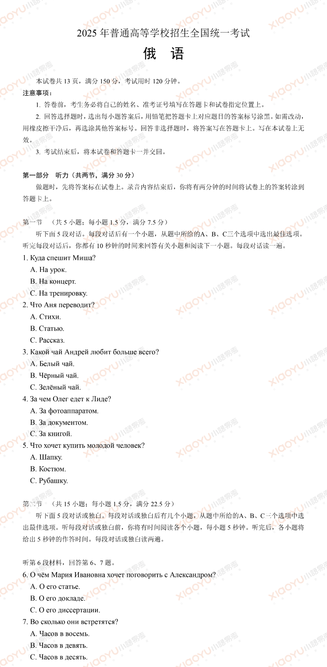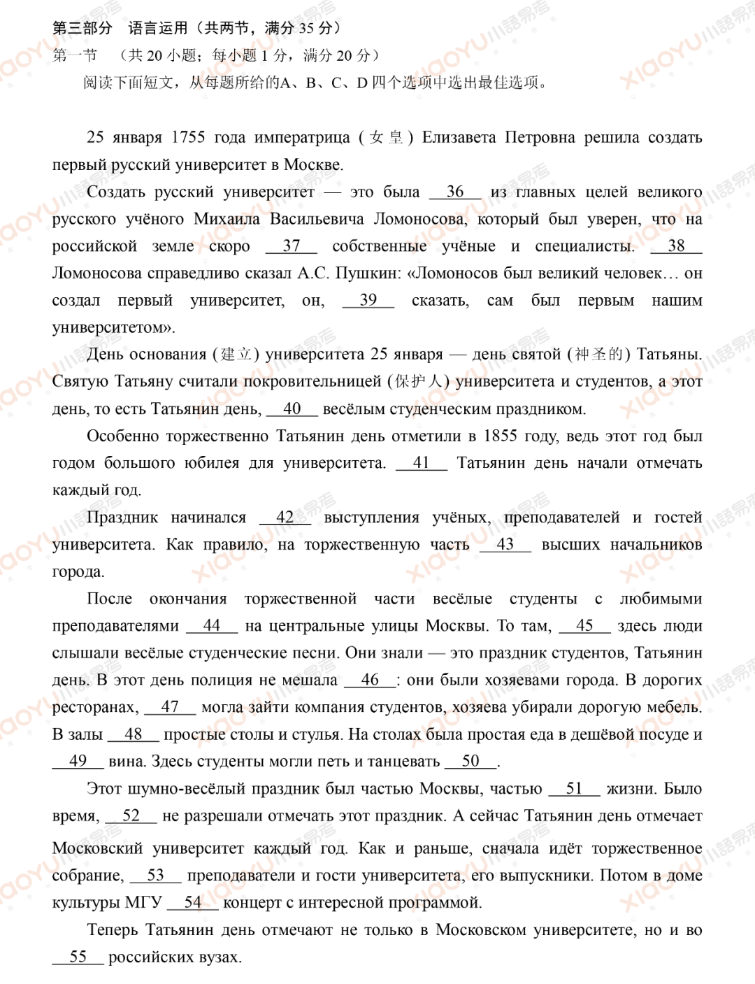 紧扣文化话题(如罗蒙诺索夫和莫斯科大学的创立),语境逻辑清晰,对考生上下文理解和词性辨析提出较高要求。